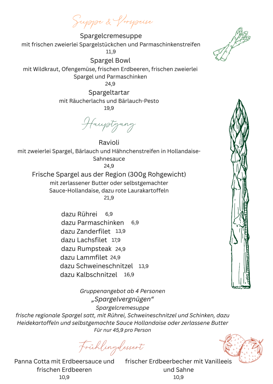 Genießen Sie jetzt frischen, regionalen Spargel in vielfältigen Variationen – klassisch, modern und mit viel Liebe zubereitet. Ob Suppe, feine Vorspeisen oder unsere Hauptgerichte mit hausgemachter Sauce Hollandaise – bei uns schmeckt der Frühling besonders gut.